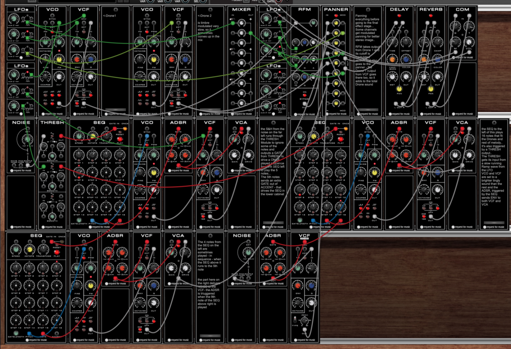 The image above shows a more elaborate patch using 32 modules, with multiple oscillators, filters, envelopes, sequencers and more.