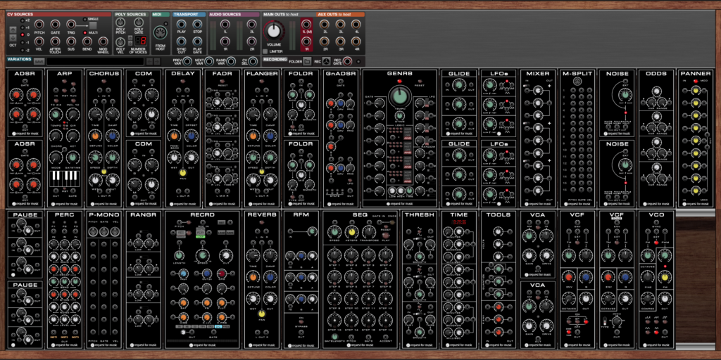 While my original Formant had 4 VCOs, 6 filters, 4 ADSRs, 2 VCAs, 2 LFOs and a COM module, in the software version all those modules are present and can be used in a patch multiple times.